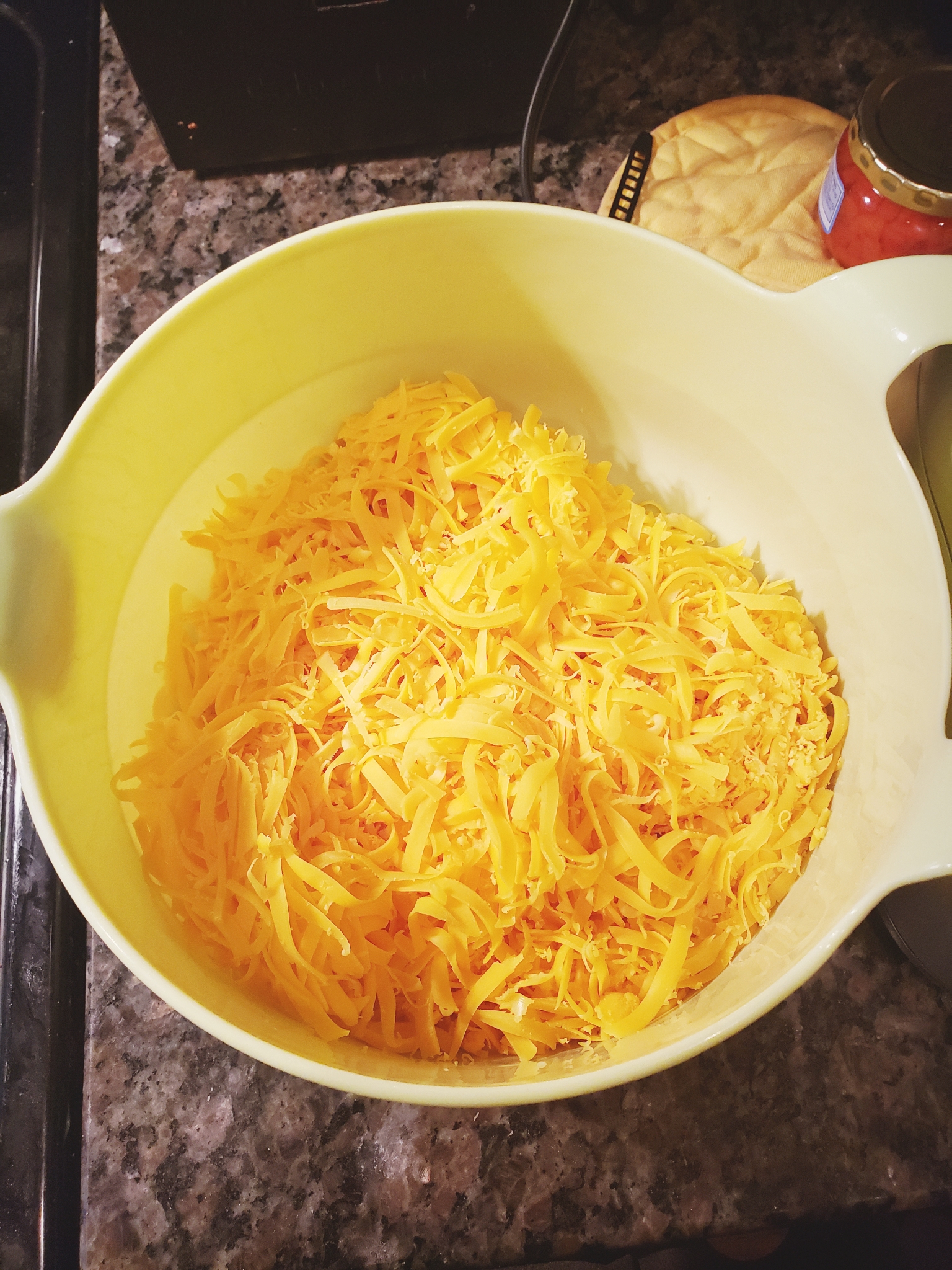 Next, shred your cheese. For this I use my food processor. You can really use any cheese you like. The options are limitless… if you’re brave! I tend to stick with sharp and mild cheddars. I like to use the block cheese instead of the pre shredded, but if that’s what you got, it works just as well!